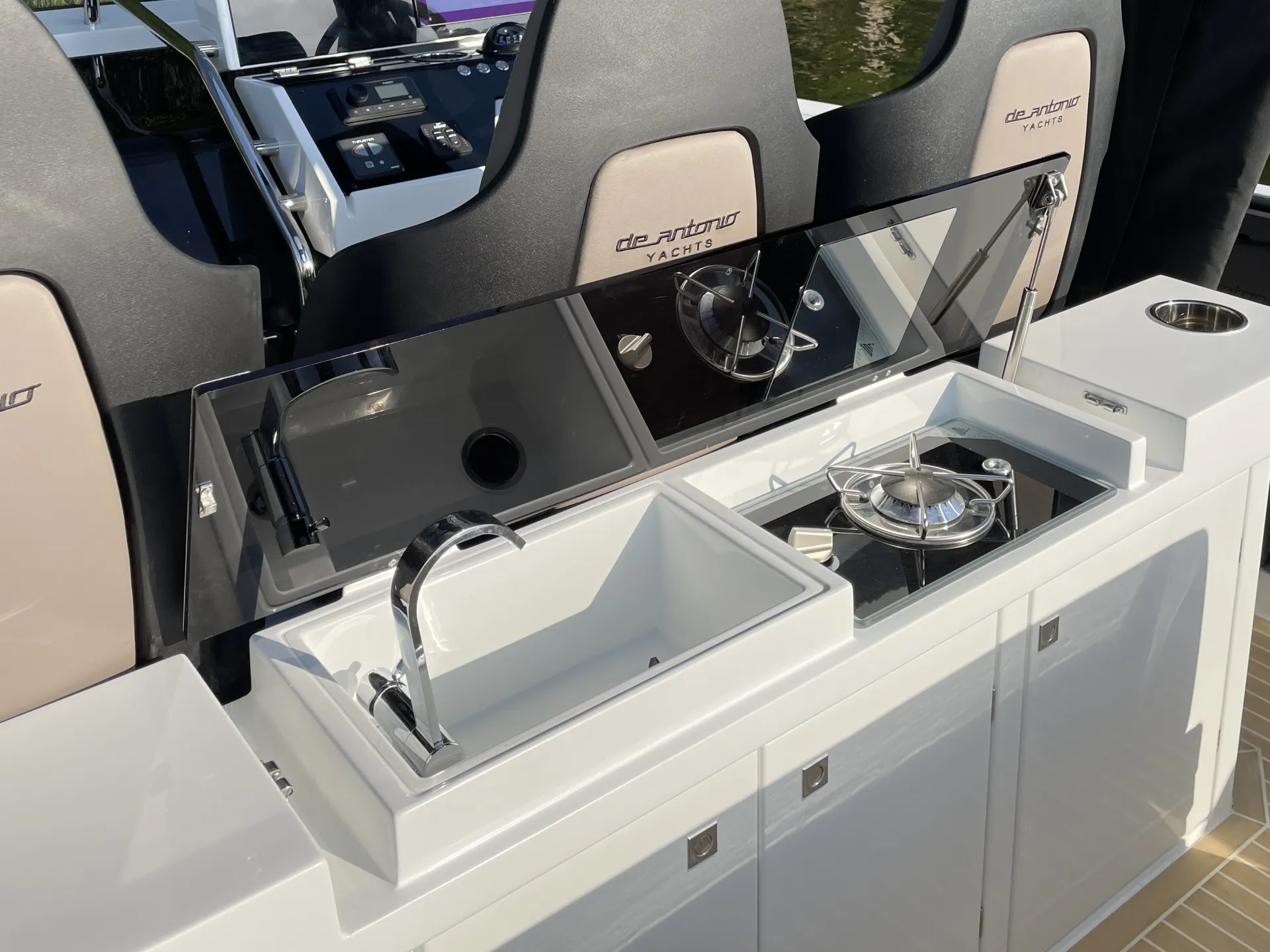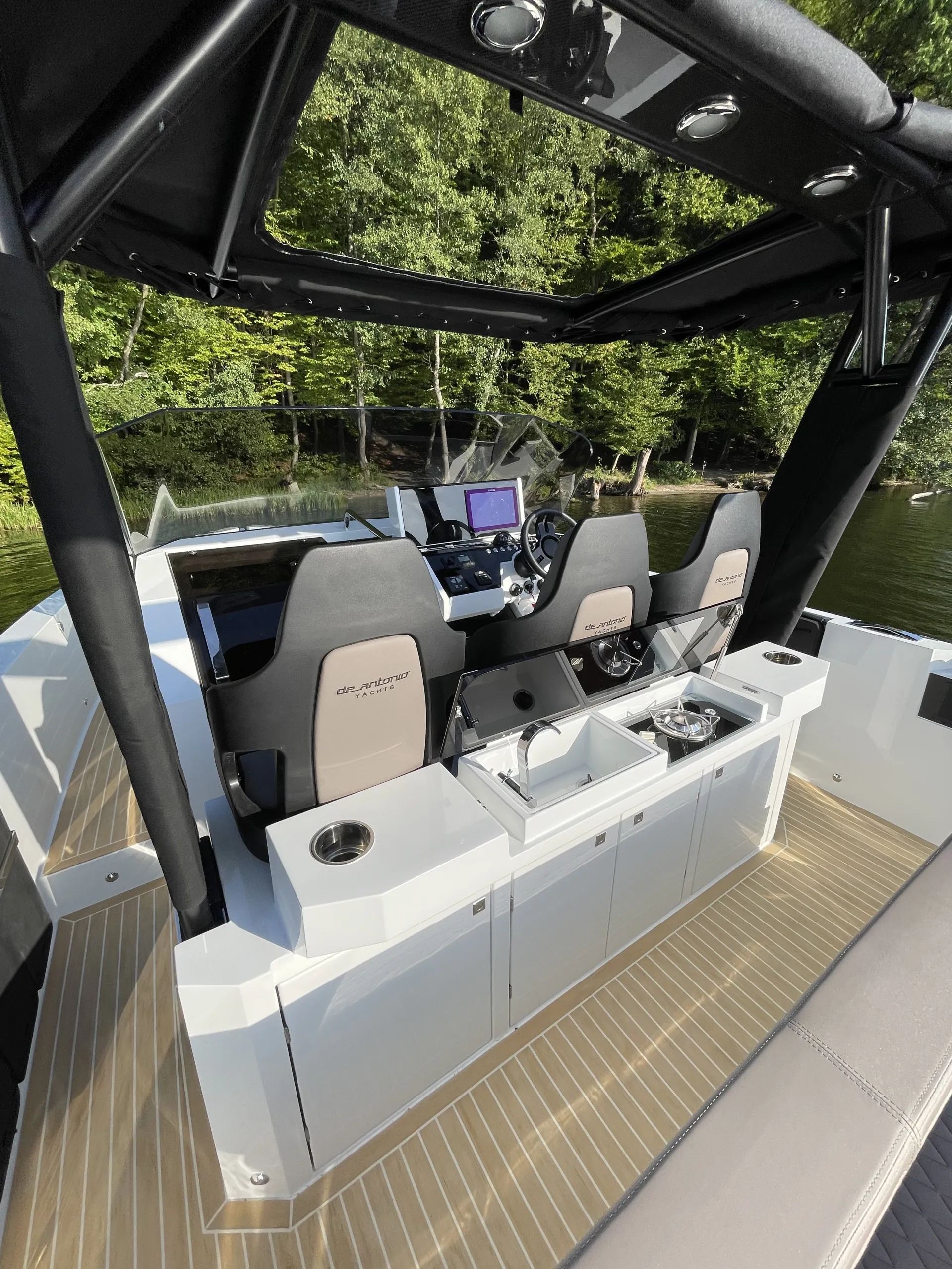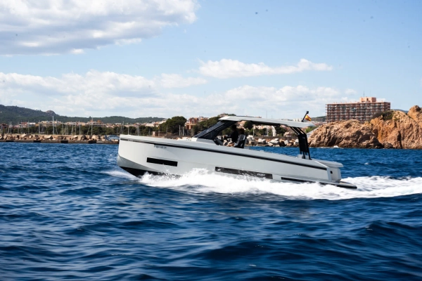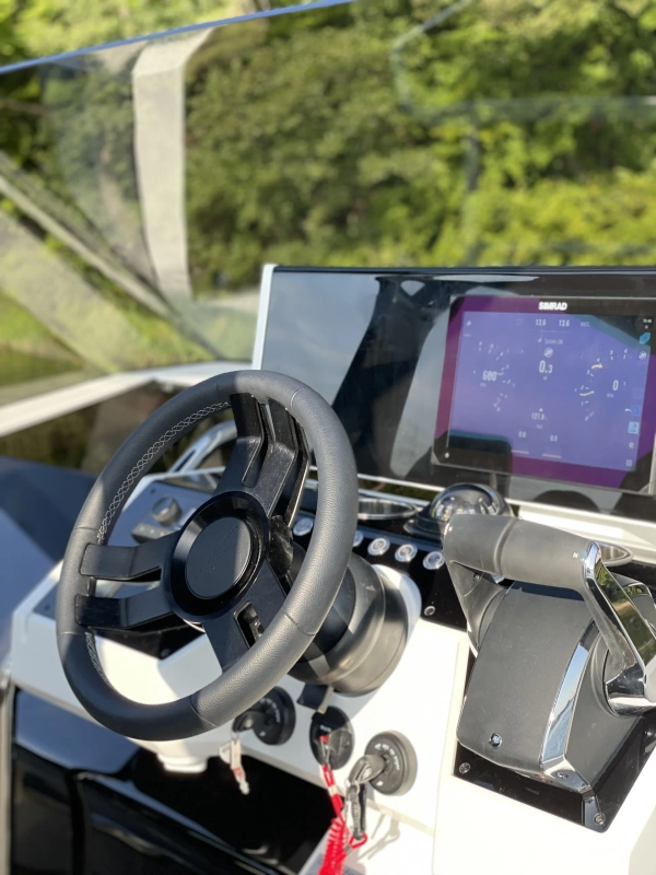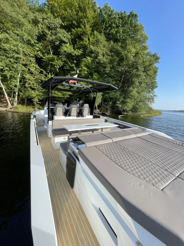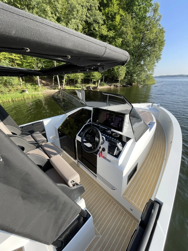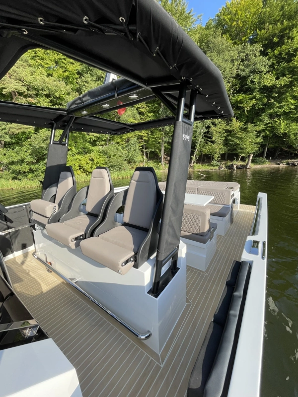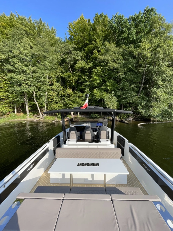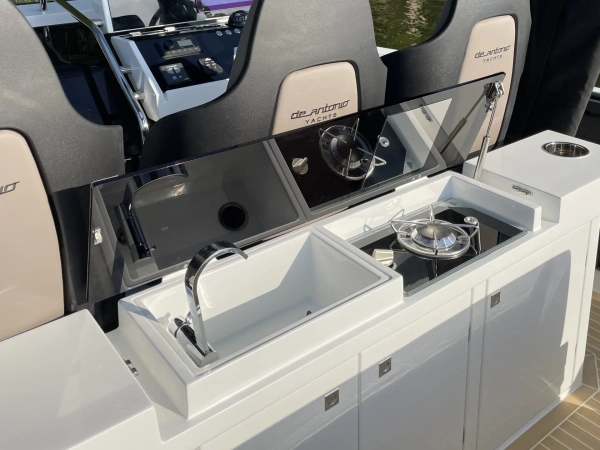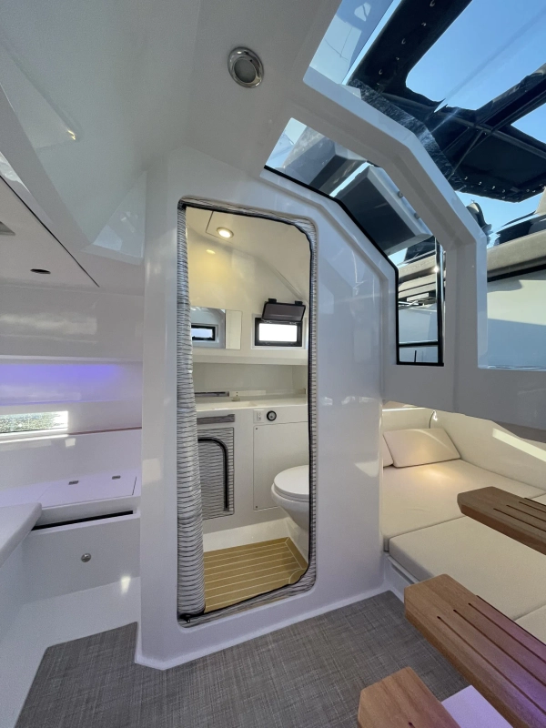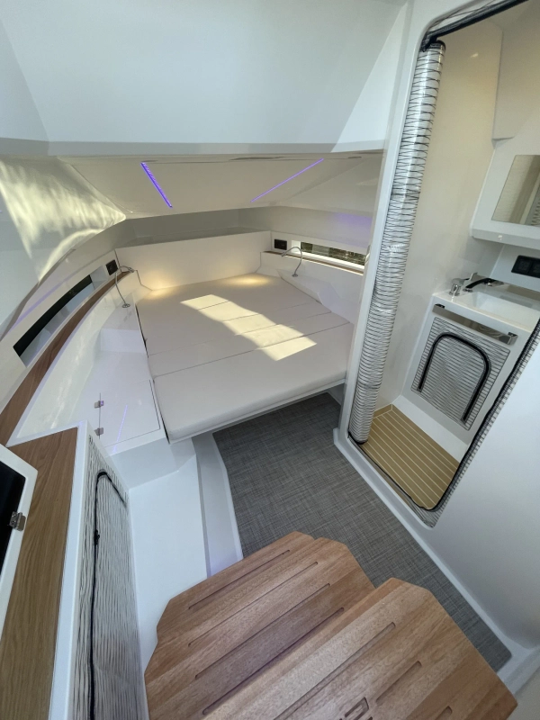 Acabamentos em carbono na proa - Almofadas e estofados Premium Morbern Sundance HERM - Banco do piloto em Morbern Allante na cor cinza - Banheiro completo (vaso sanitário elétrico) - Bombas de porão - Buzina - Cabine de popa - Cabine de proa com cama de casal - Carregador de bateria - Casco na cor branca com Soft-Top - Chuveiro no deck - Cozinha externa completa (geladeira 49L, pia, cooktop vitrocerâmico) - Cunhos retráteis em alumínio - Energia de cais AC e cabo - Entrada USB - Escada de banho - Janelas laterais no casco (cabine de popa e cabine de proa) - Luzes de navegação em LED - Luzes decorativas em LED no deck - Mastro de bandeira em fibra de carbono - Mesa no deck - Piso em teak sintético Flexiteek® (acabamento escovado com linhas pretas) - Sistema de áudio Fusion RA60 (4 alto-falantes) - Sistema de navegação Simrad GO12 XSE (12') com sonda de profundidade HDI - Suporte de âncora, âncora, corrente e guincho elétrico