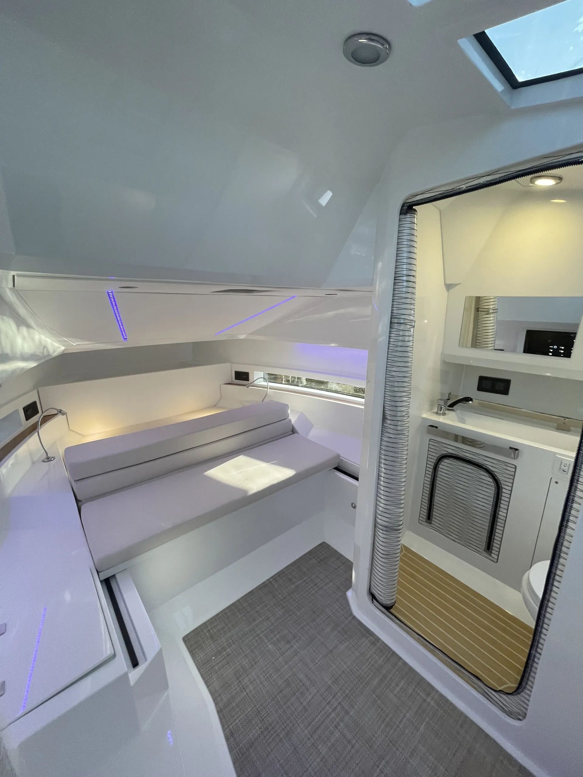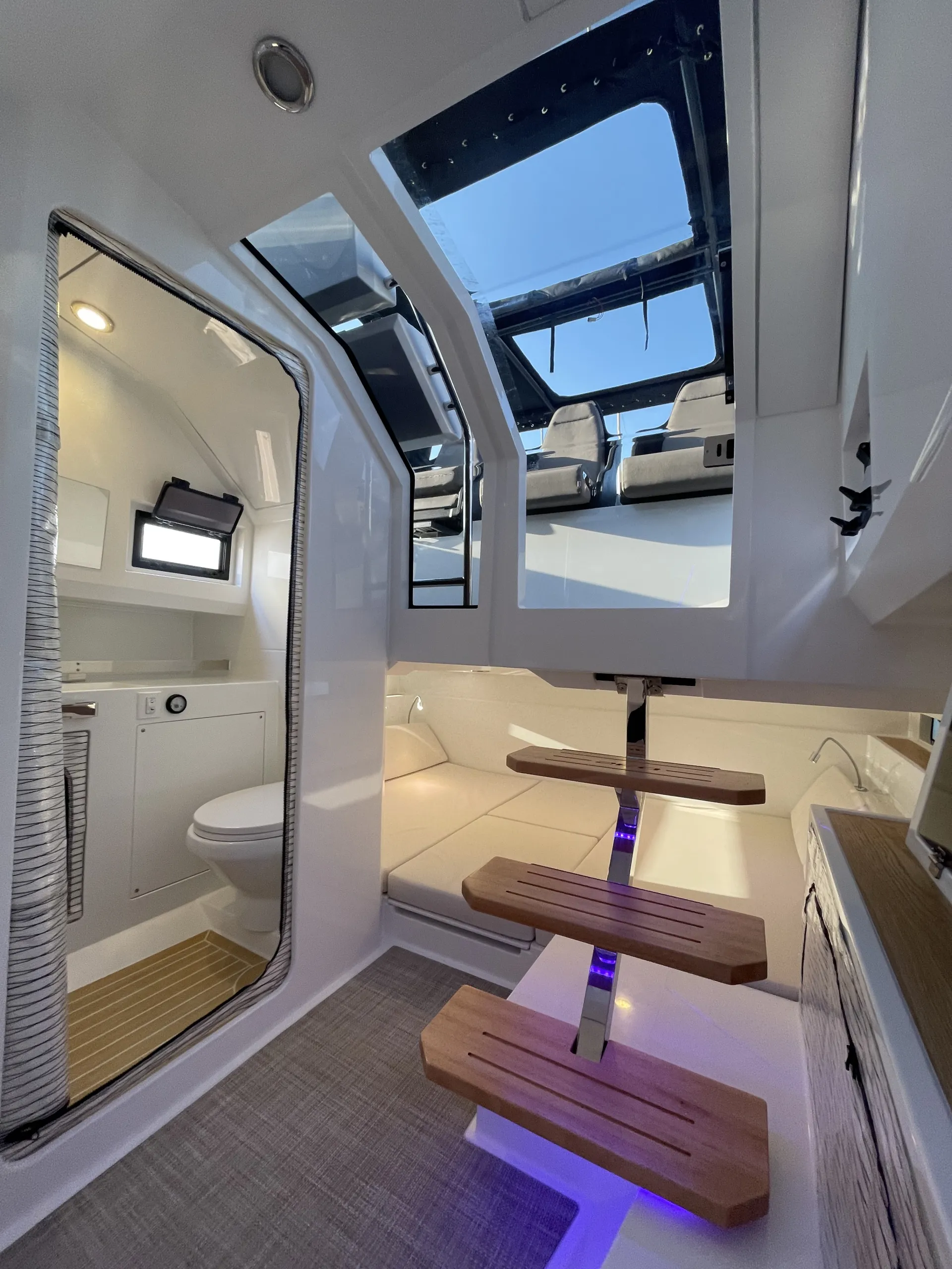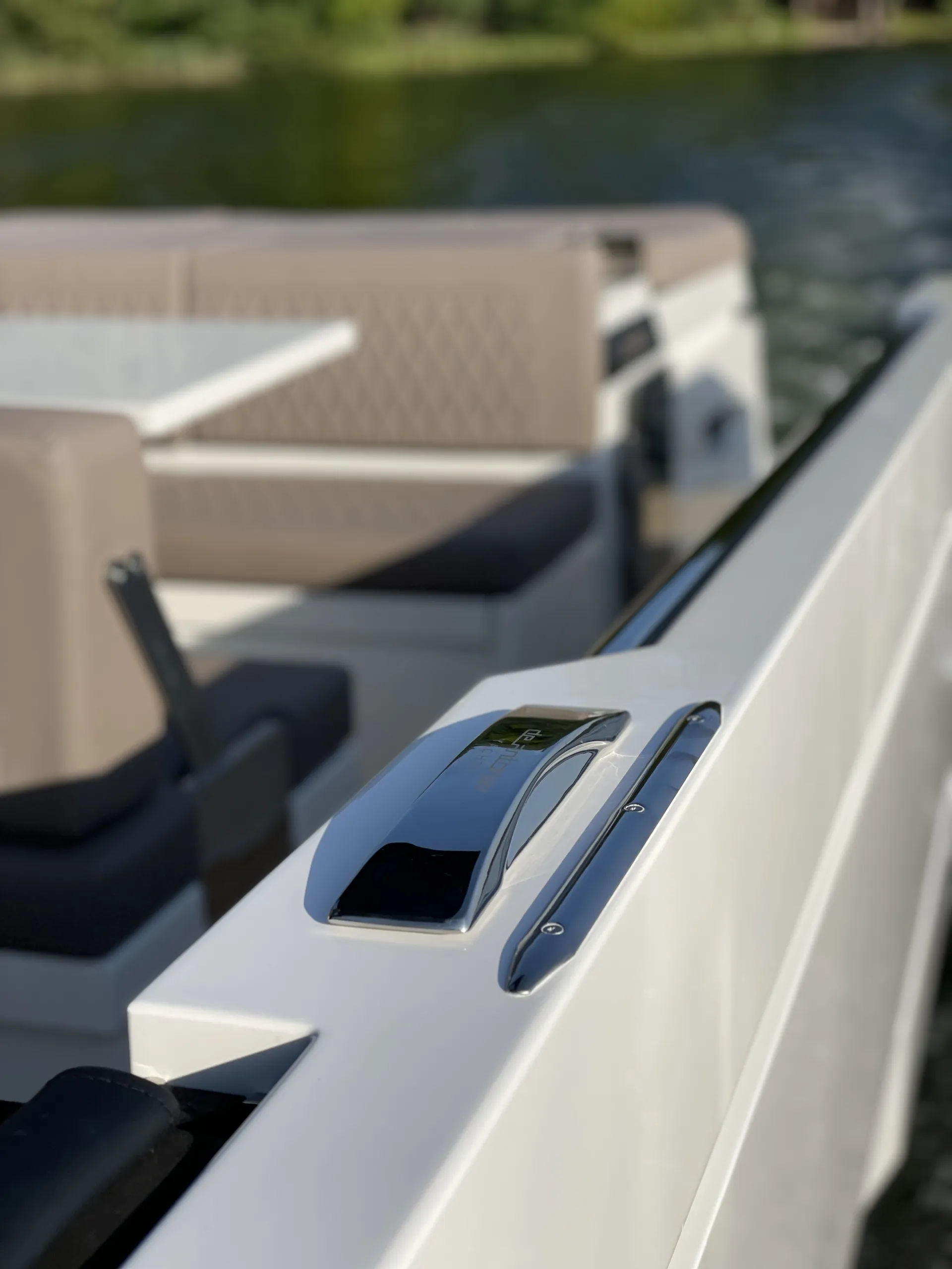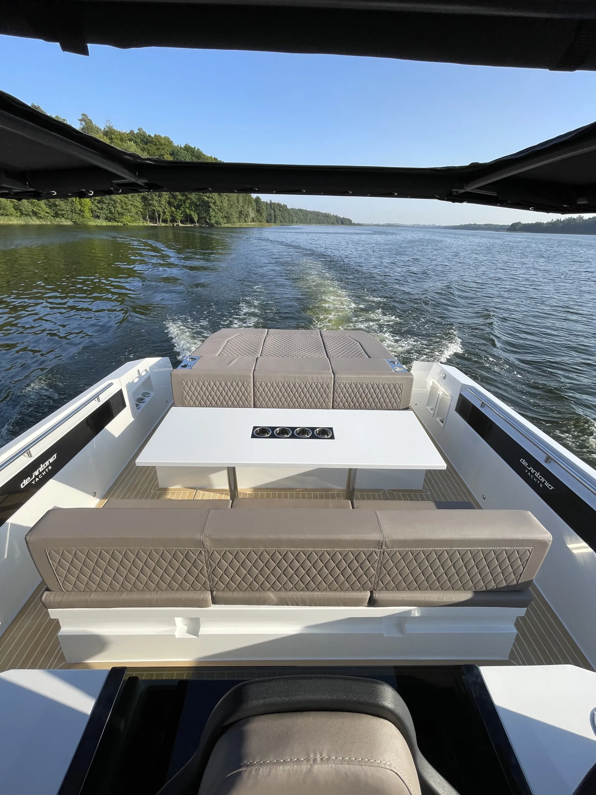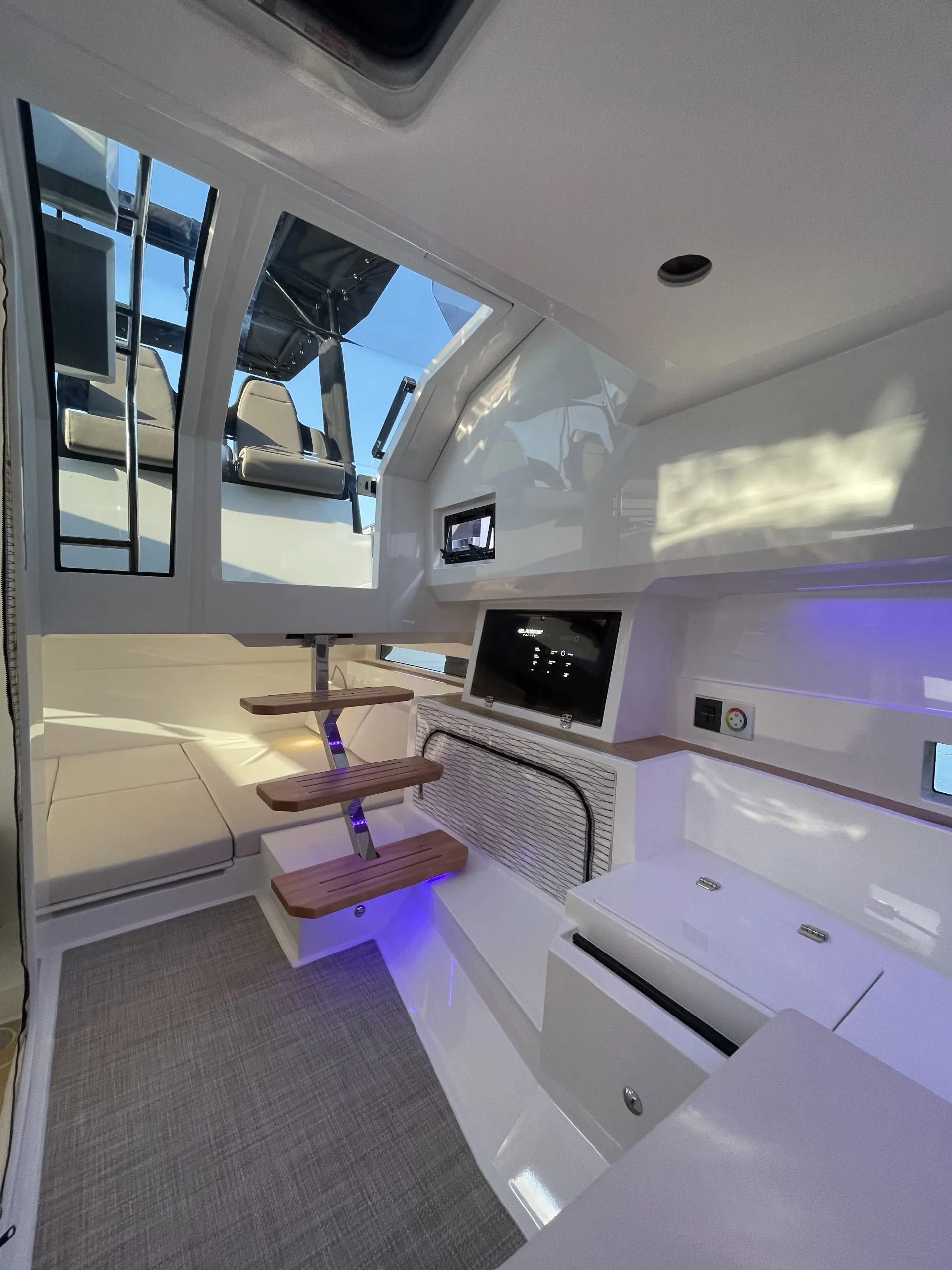 Acabamentos em carbono na proa - Almofadas e estofados Premium Morbern Sundance HERM - Banco do piloto em Morbern Allante na cor cinza - Banheiro completo (vaso sanitário elétrico) - Bombas de porão - Buzina - Cabine de popa - Cabine de proa com cama de casal - Carregador de bateria - Casco na cor branca com Soft-Top - Chuveiro no deck - Cozinha externa completa (geladeira 49L, pia, cooktop vitrocerâmico) - Cunhos retráteis em alumínio - Energia de cais AC e cabo - Entrada USB - Escada de banho - Janelas laterais no casco (cabine de popa e cabine de proa) - Luzes de navegação em LED - Luzes decorativas em LED no deck - Mastro de bandeira em fibra de carbono - Mesa no deck - Piso em teak sintético Flexiteek® (acabamento escovado com linhas pretas) - Sistema de áudio Fusion RA60 (4 alto-falantes) - Sistema de navegação Simrad GO12 XSE (12') com sonda de profundidade HDI - Suporte de âncora, âncora, corrente e guincho elétrico